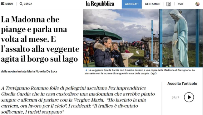 Również trzeciego dnia tego miesiąca, jak to ma miejsce już od prawie pięciu lat, Madonna przemówiła. Głosem 53-letniej pani Giselli Cardii, byłej przedsiębiorczyni, która teraz została wizjonerką, Madonna z Trevignano, której twarz podobno jest mokra od krwawych łez, skierowała wczoraj swoje słowa do setek wiernych zgromadzonych na pięknym płaskowyżu z widokiem na jezioro Bracciano.