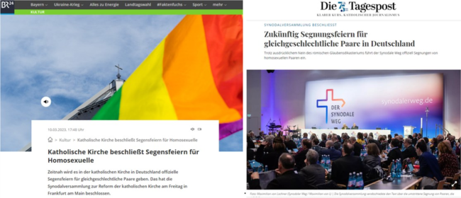 BR24: „Synodalne zgromadzenie ds. reformy Kościoła katolickiego postanowiło w piątek we Frankfurcie nad Menem celebrować oficjalne błogosławieństwo par homoseksualnych. Za głosowało 176 z 202 członków zgromadzenia, przeciw było 14. Wstrzymało się 12. Osiągnięto również niezbędną większość dwóch trzecich głosów biskupów. Obrzędy mają zostać wprowadzone w najbliższym czasie i będą ocenione w 2026 roku. Trzy lata do tego czasu należy wykorzystać na stworzenie form i formy liturgicznej uroczystości z udziałem biskupów.