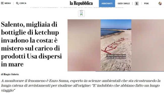 Tajemnicza sprawa: na plaże Apulii, zarówno od strony Morza Śródziemnego, jak i Morza Jońskiego, woda wymyła na plaże tysiące butelek ketchupu. Wyprodukowanego w USA i najwyraźniej przeznaczonego na rynek amerykański.