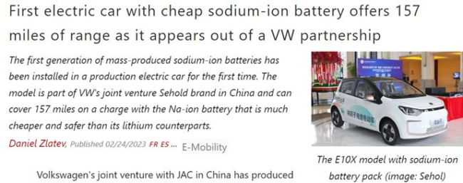 Chińczycy (do spółki z Volkswagenem) pokazali prototyp pierwszego samochodu napędzanego elektrycznością zmagazynowaną w akumulatorach – uwaga! – sodowo – jodowych. Czyli wypełnionych solą kuchenną, z grubsza biorąc.