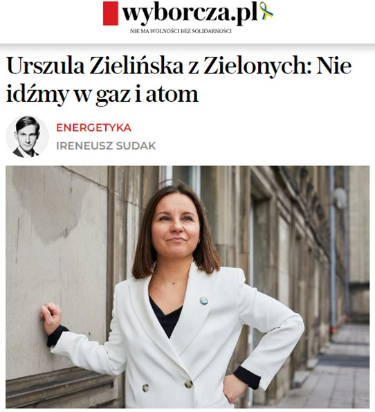 No i hops: „Wyborcza” właśnie przeprowadziła wywiad z panią Urszulą Zielińską, która namawia: „Nie idźmy w gaz i atom”.