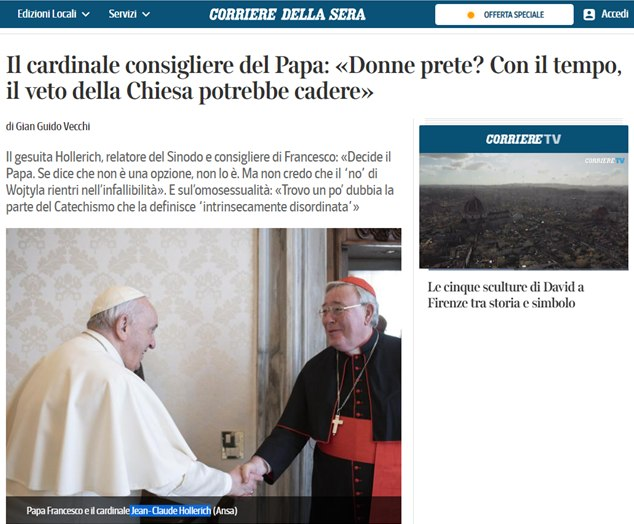 I w tym samum dniu, w którym prefekt watykańskiej kongregacji ds. biskupów jezuita Jean-Claude Hollerich powiedział w wywiadzie dla „Corriere della Sera”, że nadejdzie taki dzień, w którym i w Kościele katolickim również kobiety będą mogły otrzymywać święcenia kapłańskie.