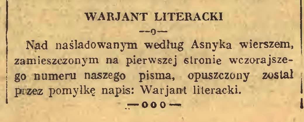 Dopiero w następnym numerze „Dziennika Ludowego” ukazało się wyjaśnienie, że wiersz jest fałszywką, nazwaną „wariantem literackim”. Można się domyślić, jak się cieszyli redaktorzy z zagrania na cenzorskim nosie. W gazecie nie wyjaśniono jednak, kto ów Asnykowski „wariant” napisał. A „pomyłkę”, domyślam się, można między bajki włożyć.