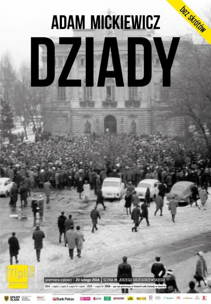 Na afiszu „Dziadów” mamy zdjęcie Biblioteki Głównej Uniwersytetu Warszawskiego. Na dziedzińcu przed Biblioteką odbył się pamiętny wiec 8 marca 1968 roku. Żądano m.in. przywrócenia „Dziadów” w Teatrze Narodowym. Zdjęte zostały z powodu demonstracyjnych oklasków w każdym miejscu, w którym pojawiały się jakiekolwiek odniesienia do stosunków polsko-rosyjskich. Ingerowała ambasada radziecka, zresztą nie musiała tego robić, bo Gomułka był bardziej papieski od papieża. Witold Filler tłumaczył, iż wykorzystywanie fragmentów utworu do prowokacji antyradzieckich było rzeczą „obrzydliwą”.