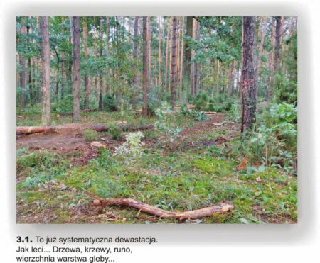 O czymś niepokojącym to świadczy. Zaczyna brakować często spotykanych owadów. Zanikają widziane dawniej rośliny. Las za to grzmi odgłosami spalinowych pił i silników ciężkich pojazdów. Nie pachnie żywicą sosen, śmierdzi benzyną i ropą naftową. Nierzadko, nie tylko w czasie chłodów wiosennych czy jesiennych, między mgłami snują się dymy ognisk, rozpalanych w lesie przez pracowników nadleśnictwa. A co raz poszukujący zanikających grzybów lub jagód w rozrytym przez ciągniki runie, natykają się na porozrzucane przez nich między ściętymi sosnami i dębami porzucane butelki i puszki, najczęściej po piwie.