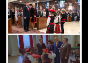 Nie zabrakło polonijnego folkloru. Ale też wcześniej sprawdzonego. Obecni byli krakowiacy i górale, którzy i tak lubią tańczyć i śpiewać przed władzą. Przybyli harcerze, weterani i poczty sztandarowe. Kilku jurnych wojskowych w wysokich butach i z dobytymi szablami przemaszerowało groźnie przez scenę, przypominając Polonii, że historia Polski była zawsze związana z krwawymi bataliami. Scena wraz z publicznością przypominała opisy Gombrowicza w Trans-Atlantyku.