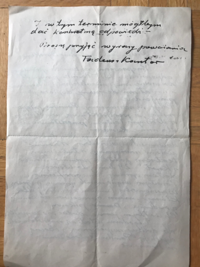 Na koniec mamy jeszcze w spektaklu manifest Kantora. Zamiast manifestu (w felietonie wolno!) dołączymy na puentę w puencie oryginał i autentyk. Oto on: Odręczne pismo Kantora datowane na 1953 rok, list mistrza in spe do mojego ojca. Pokazuje nie jak to się wszystko skończyło, ale jak się zaczęło.