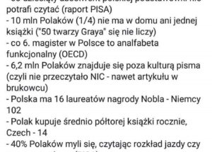 Zestawienie myśli księdza profesora Tischnera z poglądami lansowanymi przez cytowanego trzydziestolatka „P” powtarzajacego za Michalkiewiczem brednie przeciwne wszelkiemu rozumowi jest dość szokujące. Mądrość mysliciela z biedakiem otumanionym przez idiotów. Dla mnie to nie jest przerażające ale smutne. Internet masowo produkuje takich nieszczęśników, którzy na złość babci odmrożą sobie uszy. Upadek autorytetów prowadzi do takich właśnie idiotyzmów. Grawitacji ci „myśliciele” przeciwstawiaja tzw. „inną narrację” zgodnie z którą woda płynie pod górkę. Tu nie pomoże Kopernik. Potrzebna zasadnicza zmniana systemu edukacji ale i więcej psychiatrów.