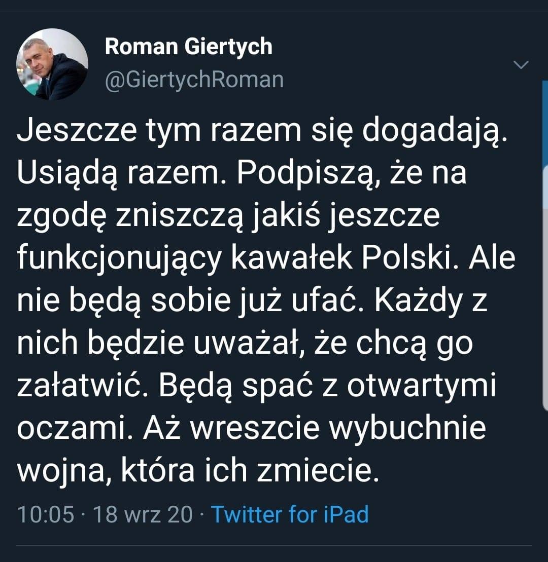 Giertych wie, bo sam w czymś takim przez lata uczestniczył. Dzisiaj mści się na Kaczorze, bo ten bez żadnych skrupułów zmiótł jego partię ze sceny politycznej, robiąc z niej nic nieznaczące ugrupowanie „kanapowe” (jak to niegdyś się mówiło).