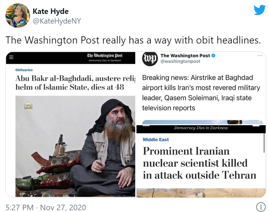 Przeglądając tweety ludzi znanych i ważnych dowiadujemy się , że Fachrizadeh został zabity, by sabotować główną inicjatywę polityki zagranicznej Bidena na Bliskim Wschodzie, iż jest to „oburzająca akcja zmierzająca do podminowania dyplomatycznych relacji między nową administracją a Iranem” oraz próba sabotowania możliwości administracji Bidena, by ponownie wejść do JCPOA.