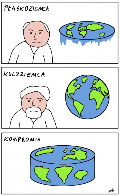 Niech się NARÓD jednoznacznie wypowie, czy chce żyć na płaskim, czy na kulistym. A także w kwestii podziału. Jeżeli większość zagłosuje za żółwiami, zwycięży demokratyczne przekonanie o prawdziwym wyglądzie naszej planety.