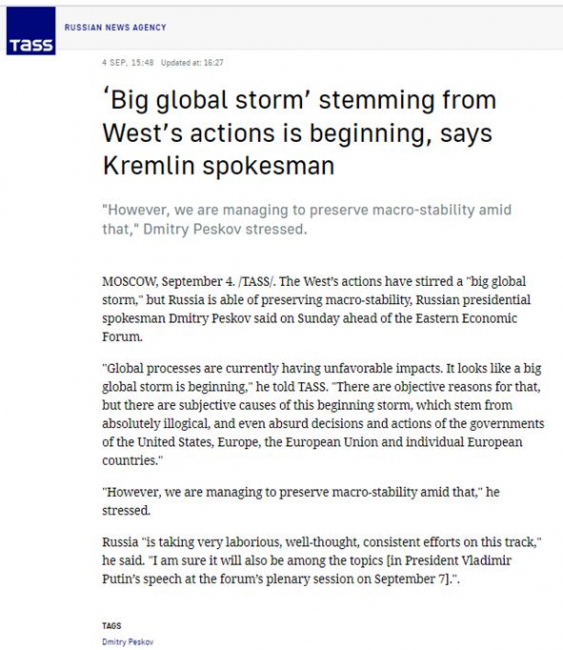 „Globalne procesy mają obecnie niekorzystne skutki. Wygląda na to, że zaczyna się wielka globalna burza” – powiedział TASS rzecznik Putina Dmitrij Pieskow przed Wschodnim Forum Ekonomicznym. „Są obiektywne powody, ale są subiektywne przyczyny tej rozpoczynającej się burzy, która wynika z absolutnie nielogicznych, a nawet absurdalnych decyzji i działań rządów Stanów Zjednoczonych, Europy, Unii Europejskiej i poszczególnych krajów europejskich”.
