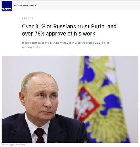 Ponad 81% Rosjan ufa Putinowi, a ponad 78% aprobuje jego pracę. Michaiłowi Miszustinowi zaufało 62,5% respondentów – wynika z Ogólnorosyjskiego Centrum Badania Opinii Publicznej (https://tass.com/society/1501793).