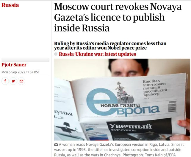 Sąd w Moskwie odebrał Nowoj Gazietie licencję dla mediów drukowanych, skutecznie zakazując jej działalności w Rosji. To w 10 miesięcy po tym, jak Dmitrij Muratow redaktor naczelny tej bohaterskiej, demokratycznej gazety, zdobył pokojową nagrodę Nobla.