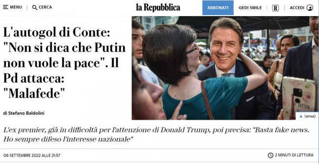 Były premier Włoch i obecny lider populistycznego Ruchu 5 Gwiazd Giuseppe Conte był łaskaw powiedzieć „niech nikt nie mówi, że Putin nie chce pokoju” (https://www.repubblica.it/…/conte_non_SI_dica_che…/…).