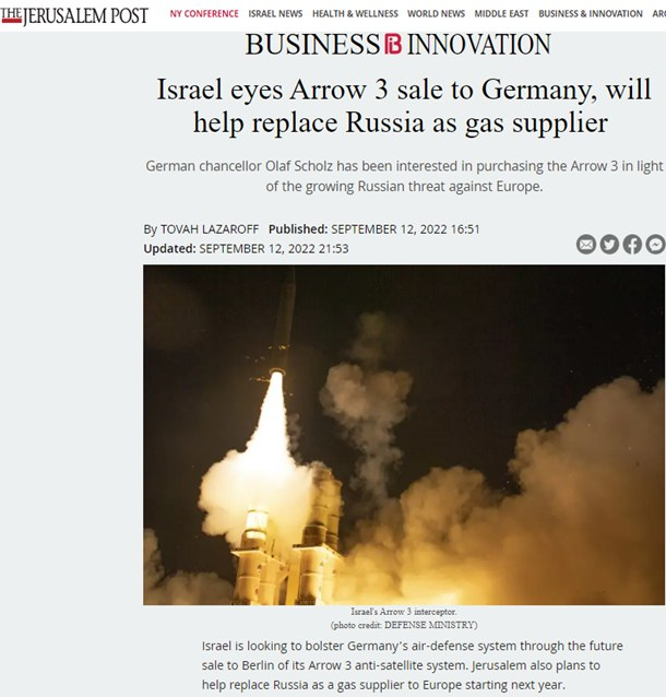 Po wizycie kanclerza Scholza w Jerozolimie zapadła decyzja, że Izrael dostarczy Niemcom system obrony przeciwlotniczej. Będzie to antybalistyczny system „Arrow 3”, zdolny zestrzelić poza atmosferą balistyczne rakiety wroga, ale także jego satelity. (Izrael ma taką zabawkę, jako jedyny kraj na świecie).