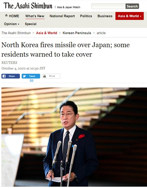 Północna Korea wystrzeliła rakietę balistyczną, która przeleciała nad Japonią. Włączyły się alarmy oznaczające, że mieszkańcy mają biec do schronów (https://www.asahi.com/ajw/articles/14734203).
