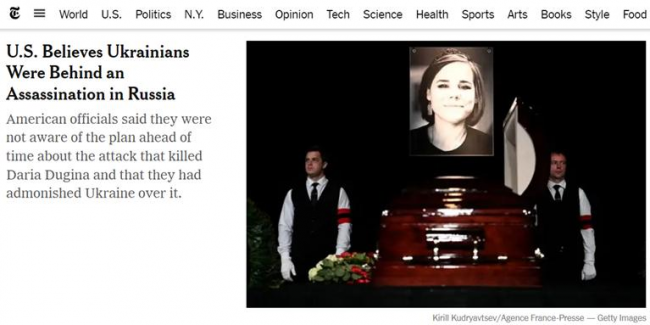 Amerykański wywiad uważa, że rząd kijowski stoi za zabójstwem Darii Duginy, córki rosyjskiego ultranacjonalistycznego filozofa Aleksandra Dugina zabitego w sierpniowym ataku. Zostało to ujawnione przez „dobrze poinformowane źródła” New York Timesowi (https://www.nytimes.com/…/ukraine-russia-dugina…), z podkreśleniem, że Stany Zjednoczone „nie brały udziału w ataku, ani nie dostarczały informacji, ani innych form pomocy”. Urzędnicy informują również, że amerykański wywiad nie wiedział o operacji i sprzeciwiłby się, gdyby się z nimi skonsultowano.