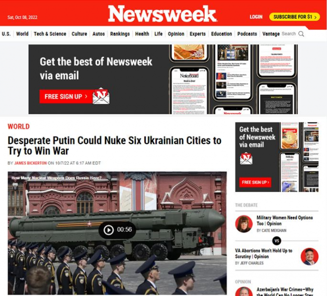 I dalej: „Nie sądzę, by Putin mógł użyć taktycznej broni nuklearnej na polu bitwy lub w »uderzeniu demonstracyjnym« mającym na celu zastraszenie Ukrainy i Zachodu – powiedział Newsweekowi Profesor Eric G. Swedin, który wykłada historię na Weber State University. Raczej prawdopodobnie przejdzie do bezpośrednich ataków na główne ukraińskie miasta. Obawiam się, że gdy Putin zostaje zepchnięty w róg Ukrainy, gdy jego siły zbrojne staną w obliczu klęski, może z łatwością wybrać atak taktyczną bronią jądrową w desperackiej próbie zmiany wyniku”