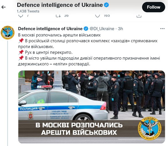 Onet.pl: „Według informacji ukraińskiego wywiadu wszystkie jednostki wojskowe na obrzeżach Moskwy zostały postawione w stan gotowości bojowej. Do centrum miasta mają zmierzać policja i elitarne oddziały podległej Ministerstwu Spraw Wewnętrznych Gwardii Narodowej z dywizji imienia Feliksa Dzierżyńskiego” (https://www.onet.pl/…/ukrainski-wywiad…/s7pqzxn,79cfc278). Rozpoczeły się aresztowania wojskowych.