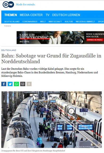 À propos: Deutsche Bahn poinformował w sobotę, że przyczyną zakłóceń w sieci kolejowej w północnych Niemczech były celowe akcje sabotażu.