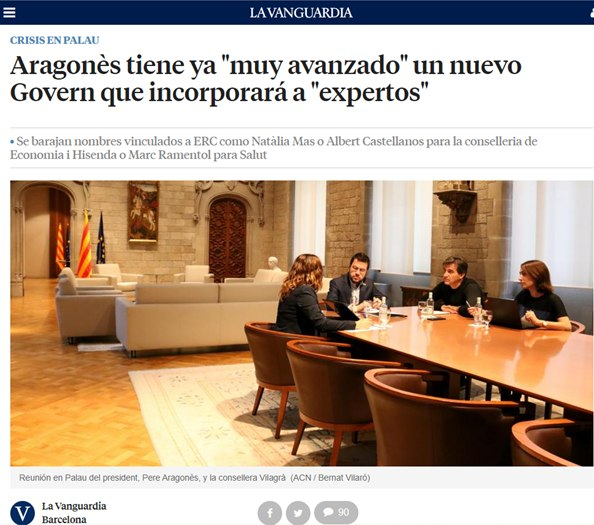 Szer regionalnego rządu Generalitat z ERC Pere Aragonès, wyrzucił swojego zastępcę Jordiego Puigneró i zapowiedział, że utworzy rząd mniejszościowy. Wykluczył rozpisanie nowych wyborów w obliczu nadchodzących bardzo trudnych czasów – wojna w Ukrainie i kryzys energetyczny.