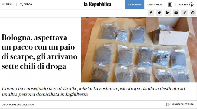 Pewien pan w Bolonii zamówił buty przez internet. Faktycznie paczkę z butami dostał, a razem z nią – druga paczkę. A w drugiej paczce – 13 przezroczystych plastikowych torebek zawierających jakąś zieloną substancję roślinną. Zabrał więc ponadplanową paczkę na posterunek policji, gdzie okazało się, że paczka zawiera 7 kilogramów dimetylotryptaminy, dość mocnego halucynogenu.