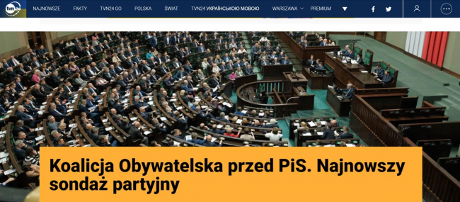 „Koalicja Obywatelska jest na szczycie październikowego sondażu preferencji partyjnych, zrealizowanego przez Kantar Public. Uzyskała 31 procent poparcia wśród respondentów. Prawo i Sprawiedliwość dostało w nim 28 procent. Na trzecim miejscu, z 10-procentowym poparciem, znalazła się Polska 2050. Kolejne miejsca zajęły Lewica (7 procent) i Konfederacja (5 procent)”.