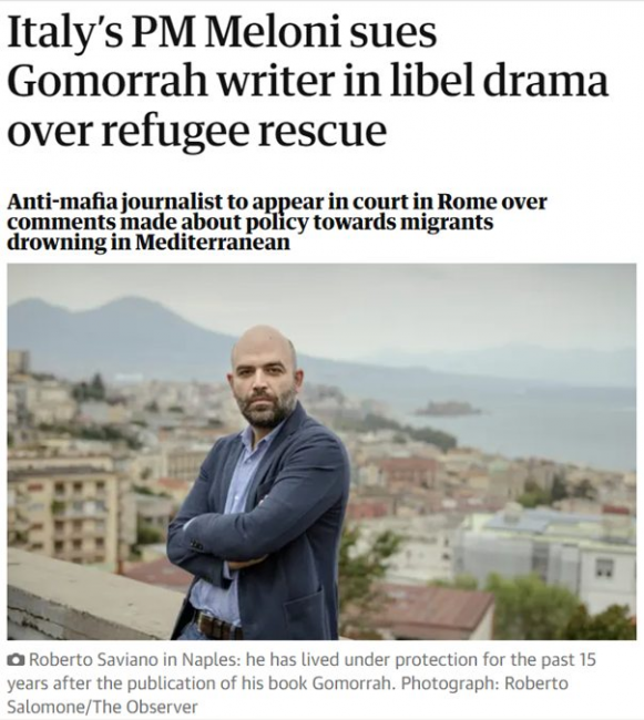Guardian: „Nowa skrajnie prawicowa premier Włoch, Giorgia Meloni, pozwała jednego z najbardziej znanych dziennikarzy na świecie, działacza na rzecz walki z mafią i praw człowieka, Roberto Saviano, o zniesławienie w związku z uwagami, które wygłosił na temat jej polityki wobec migrantów tonących w Morzu Śródziemnym.