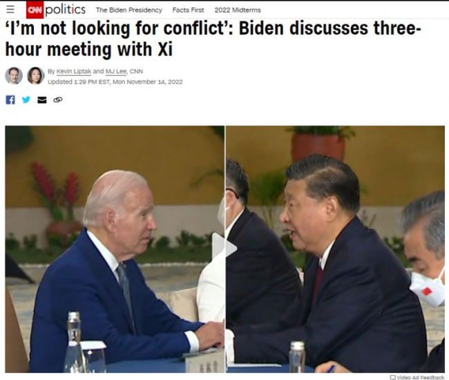 Do tych słów odniosła się bezpośrednio strona chińska po rozmowie obu przywódców. W przekazanym przez chińskie MSZ oświadczeniu Xi Jinping odniósł się do lęków USA o globalne ambicje Chin. „Chiny nie chcą zmieniać porządku światowego ani wtrącać się w sprawy wewnętrzne USA czy rzucać im wyzwania lub ich wypychać” – zapewnił, dodając, że świat jest wystarczająco duży by oba kraje mogły „współistnieć i prosperować”. Xi podkreślił jednak, że kwestia Tajwanu leży „w sercu najważniejszych interesów Chin i jest „pierwszą czerwoną linią, której nie wolno przekraczać w stosunkach Chiny-USA”. …