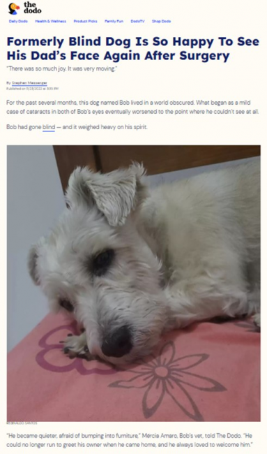 Doktor Amaro, która specjalizuje się w okulistyce była szczęśliwa, że zaraz po operacji Bob zaczął dawać zachęcające sygnały: „Patrzył na nas, jakby chciał powiedzieć: Widzę”! Wideo poniżej