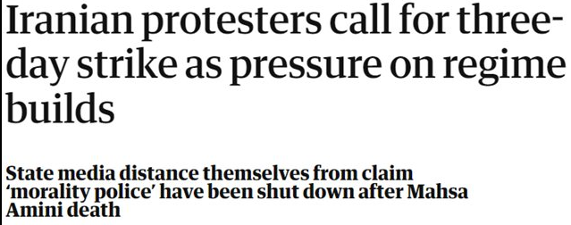 Jak poinformował prokurator generalny kraju Mohamad Dżafar Montazeri, przemawiając w Kom na spotkaniu z duchowieństwem, „władze zawiesiły działalność policji moralnej” czyli jednostki aparatu przemocy, która kontrolowała ubiór ludzi, a zwłaszcza kobiet, które aresztowała, gdy nie zakrywały się zgodnie z kodeksami dyktowanymi przez reżim Republiki Islamskiej. Tak napisała półoficjalna irańska agencja informacyjna ISNA.