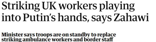 W odpowiedzi Nadhim Zahawi, urodzony w Iraku przewodniczący brytyjskiej Partii Konserwatywnej i minister gabinetu, powiedział, że strajkujący brytyjscy robotnicy działają na korzyść Putina i zapowiedział, że miejsca pracy, opuszczone przez strajkujących, zostaną zajęte przez żołnierzy. Chodzi m.in. o ratowników medycznych z karetek pogotowia i personel graniczny.