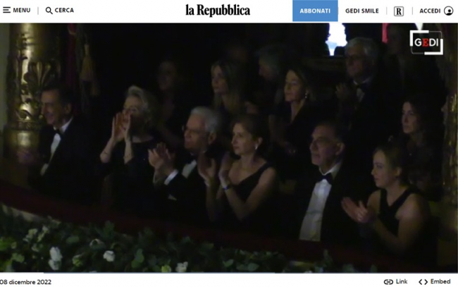 Premierę zaszczycili licznie członkowie faszystowskiego rządu włoskiego z faszystowską premier Giorgią Meloni, która w operze była po raz pierwszy w życiu, bo wolała spędzać wieczory w kółkach młodzieży faszystowskiej, a nie na przedstawieniach operowych. Nie po raz pierwszy w operze była pani Ursula von der Leyen, ponieważ jest wyrafinowaną znawczynią tematu. Na tyle, że z zatłoczonej loży rządowej po zakończeniu spektaklu krzyczała głośno „Bravi”!