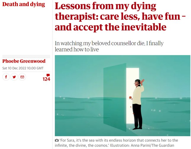 Po pierwsze artykuł z „Guardiana” pod nagłówkiem „Śmierć i umieranie”: „Lekcja od mojego umierającego terapeuty: mniej się przejmuj, miej frajdy, przyjmij, co nieuchronne”.