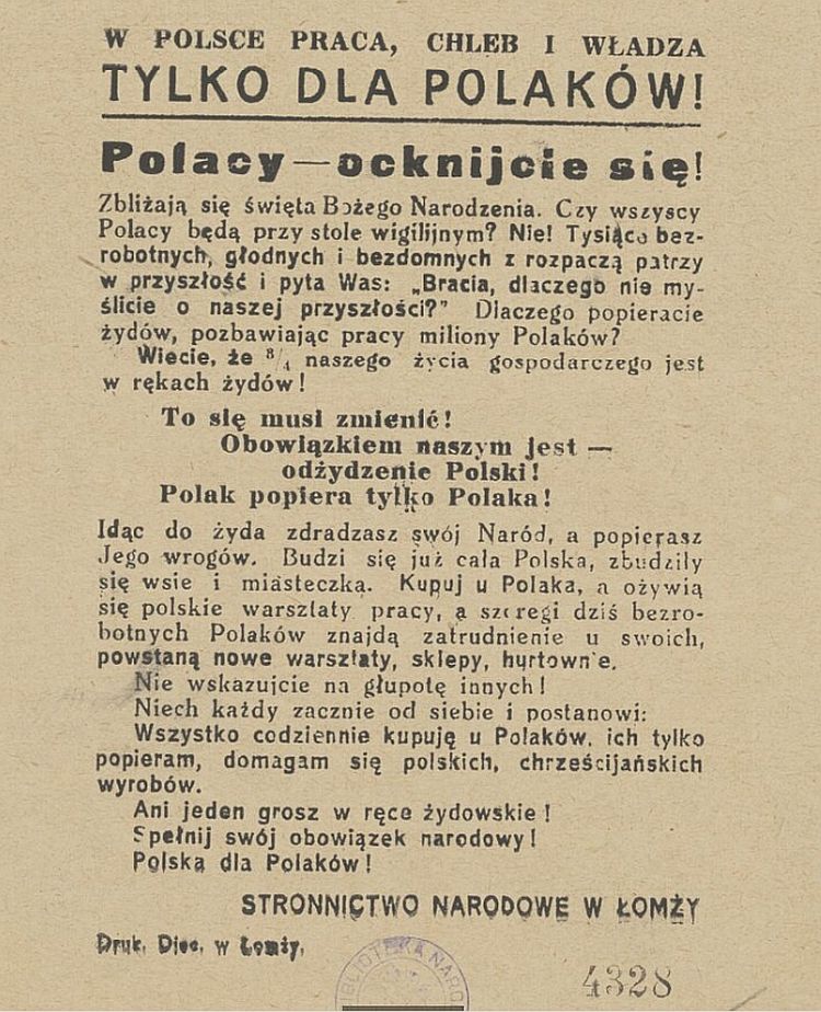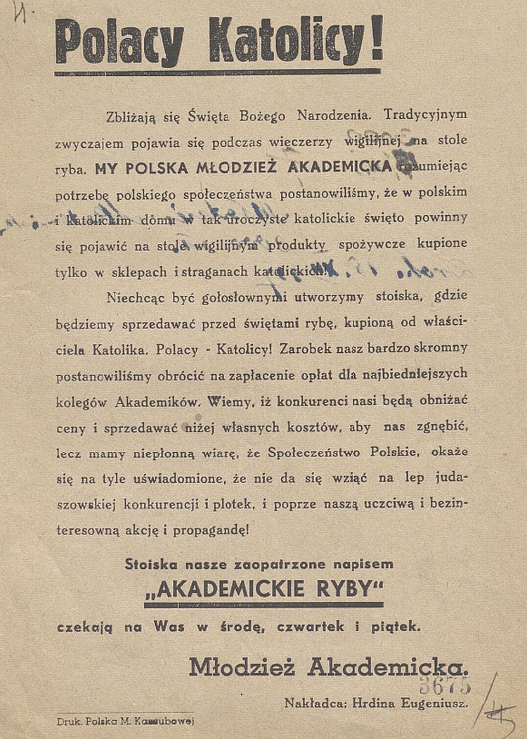 Poszukując w celach rozrywkowych starych kartek świątecznych odkopałem nieco ulotek wydawanych (głównie przed II wojną) przez rozmaite organizacje, namawiające, by przy okazji bożonarodzeniowych zakupów zrezygnować z usług sklepów żydowskich. Argumenty były różne, mniej lub bardziej prymitywne i słabo uzasadnione, ale były.