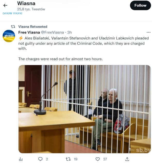 Białoruska organizacja praw człowieka Wiasna opublikowała pierwsze zdjęcia z procesu Alesia Bialackiego, białoruskiego laureata Pokojowej Nagrody Nobla z 2022 r. Oskarżony jest o „przemyt”, o nielegalny import na Białoruś pieniędzy w celu finansowania ugrupowań opozycyjnych. Bialackiemu grozi do 12 lat więzienia. Przetrzymywany w więzieniu od 2021 roku Bialacki nie przyznał się do winy.