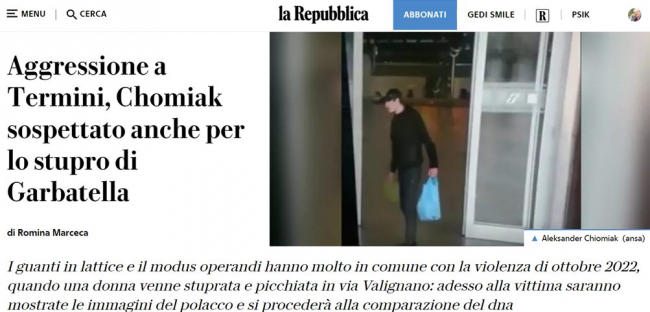 Aleksander Mateusz Chomiak z Grudziądza, człowiek, który trzykrotnie ugodził nożem młodą turystkę z Izraela na Stazione Termini w Rzymie, prawdopodobnie tylko dlatego, że miała na plecaku napis po hebrajsku, podejrzany jest także o dokonanie gwałtu na kobiecie w rzymskiej dzielnicy Garbatella. Podczas ataku na stacji używał lateksowych rękawiczek, podobnie, jak gwałciciel z Garbatelli, ale tam, w samochodzie ofiary pozostawił fragment tej rękawiczki. Obecnie śledczy porównują jego DNA z tym, które zostało odnalezione na owym fragmencie.