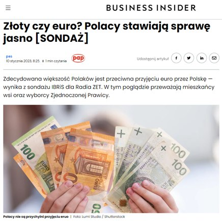 Np. „Business Insider”: „Według opublikowanego we wtorek sondażu IBRiS dla Radia ZET ze stwierdzeniem „Polska powinna przyjąć walutę euro zamiast polskiego złotego” zdecydowanie zgadza się 14,7 proc. badanych, a 9,8 proc. udzieliło odpowiedzi „raczej się zgadzam”. Jednak największą grupę stanowią ankietowani, którzy „zdecydowanie” nie zgadzają się na to — 49 proc. „Raczej” nie zgadza się na euro w Polsce 15,2 proc. przepytanych przez IBRiS dla Radia ZET. Odpowiedzi „Nie wiem/ Trudno powiedzieć” udzieliło 11,3 proc. badanych”.