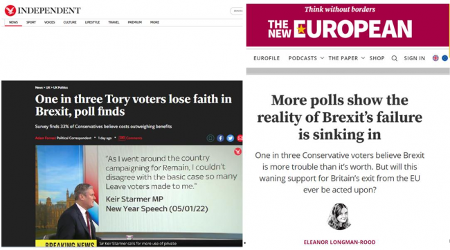 Ale kto wie, czy Starmer i Sunak wkrótce nie zajmą stanowiska w sprawie Brexitu. Najnowszy sondaż YouGov pokazuje, że ci, którzy są przeciwni i żałują wyjścia z UE, odnotowali zawrotny wzrost: obecnie jest ich prawie 60%, w porównaniu do 48%, w dniu referendum prawie 7 lat temu.