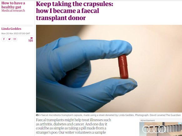 Guardian: „Przeszczepy kału mogą pomóc w leczeniu chorób, takich jak zapalenie stawów, cukrzyca i rak. A pewnego dnia może to być tak proste, jak wzięcie pigułki zrobionej z kupy nieznajomego. Nasz dziennikarz stał się dawcą.