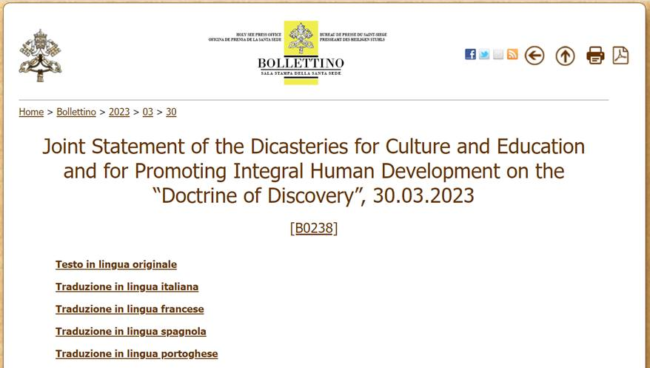 Wspólne oświadczenie w tej sprawie wydały 30 marca watykańskie dykasterie Kultury i Edukacji oraz Integralnego Rozwoju Człowieka. Cały dokument, będący reakcją na powtarzane od lat apele ludów tubylczych, można przeczytać w biuletynie prasowym na stronie Watykanu. Pada w nim stwierdzenie, że „‘doktryna odkrycia’ nie była częścią nauczania Kościoła katolickiego” oraz „Badania historyczne jasno wykazują, że omawiane dokumenty papieskie, napisane w konkretnym okresie historycznym i związane z kwestiami politycznymi, nigdy nie były uznawane za wyraz wiary katolickiej”.