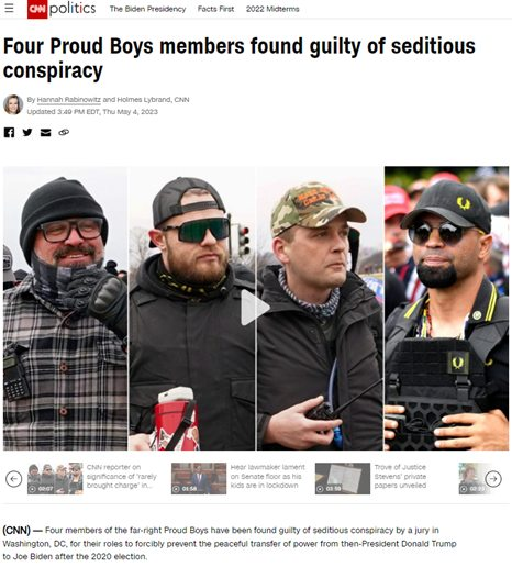 Po siedmiu dniach dyskusji sędziów Federalnego Sądu Okręgowego w Waszyngtonie, czterech członków Proud Boys, w tym były przywódca Enrique Tarrio, zostało uznanych za winnych wywrotowego spisku mającego na celu poprowadzenie powstania 6 stycznia 2021 r., kiedy tysiące zwolenników Trumpa szturmowało Kongres. Oskarżenie o działalność wywrotową jest rzadko używane w czasach współczesnych i nawiązuje do ustawodawstwa z czasów wojny secesyjnej prawie dwa wieki temu.