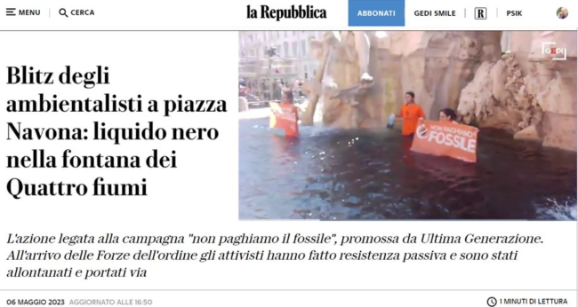 Po „Barcacci” u stóp Schodów Hiszpańskich, przyszła pora na Fontannę Czterech Rzek na Piazza Navona. Obrońcy środowiska wsypali do wody pokaźne ilości węgla roślinnego, sprawiając, że woda stała się czarna, po czym niektórzy z nich weszli do fontanny i rozpostarli transparenty z żądaniem zaprzestania eksploatacji paliw kopalnianych.