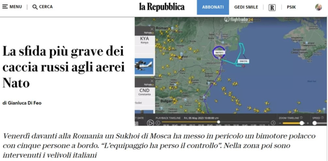 Repubblica: „Incydent, który miał miejsce nad Morzem Czarnym, nie jest zwykłą konfrontacją rosyjskich samolotów z samolotami Sojuszu Atlantyckiego, jak to ma miejsce każdego dnia od lutego 2022 roku. Oficjalne oświadczenie dowództwa warszawskiej Straży Granicznej opisuje próbę rozbicia dwusilnikowego samolotu z pięcioma osobami na pokładzie, zaangażowanego w europejską misję u wybrzeży Rumunii. „Myśliwiec Suchoj 35 wykonał agresywne i niebezpieczne manewry, w wyniku których samolot stracił kontrolę i stracił wysokość”.