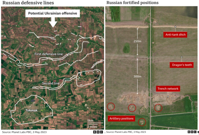 Plaże zamienione w forty. Drogi usiane obroną przeciwpancerną. Rowy, smocze zęby, drut kolczasty. To fortyfikacje wzniesione przez rosyjskie siły przez miesiące przygotowań wzdłuż wszystkich terytoriów okupowanych na froncie ukraińskim, przed spodziewaną kontrofensywą wojsk ukraińskich. Setki zdjęć satelitarnych zostały przeanalizowane i upubliczniona przez BBC. Podobne badanie zostało opublikowane wczoraj rano przez Financial Times. Patrz poniżej, link pod print screenami.