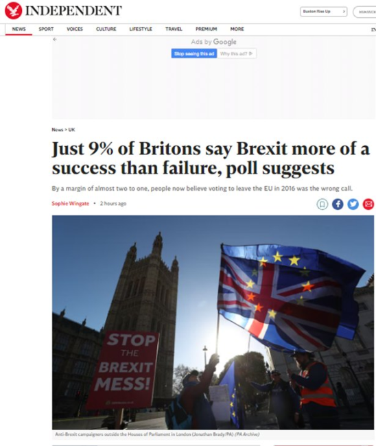 Tylko 9% Brytyjczyków uważa dziś Brexit za „sukces” – wynika z najnowsze danych z sondażu YouGov dla Sunday Times’a.