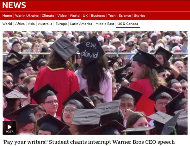 David Zaslav, szef firmy rozrywkowej (entertainment company) Warner Bros Discovery, wygłaszał przemówienie na ceremonii ukończenia studiów na Uniwersytecie Bostońskim, kiedy przerwali mu studenci krzyczący „płać swoim pisarzom”, wspierając strajk pisarzy w Stanach Zjednoczonych.