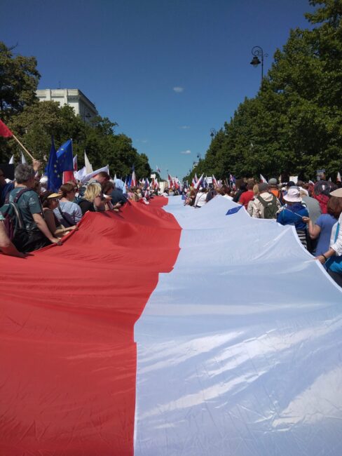 Maszerowaliśmy zgodnie, z uśmiechem na ustach, jak też z nadzieją na rychłą realizację tego celu. Powiewałam powiezioną z Wrocławia (autokarem) flagą Unii Europejskiej, współniosłam olbrzymi, kilkudziesięciometrowy narodowy sztandar, żywiołowo reagowałam na skandowanie tłumu, ulegając jego entuzjazmowi. Tuż za mną Marta Lempart wykrzykiwała przez megafon prokobiece hasła. Prosto w moje uszy. Rozognione wiecem dziewczyny tworzyły zwarty szyk, powiewały czarnymi flagami z symboliką Strajku Kobiet. Starszy pan z laską ostrożnie podtrzymywał towarzyszkę słaniającą się na nogach. Małe dziecko siedzące na grzbiecie taty powiewało papierową chorągiewką. Biało czerwoną.