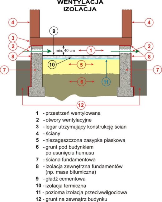 Podstawowym zagrożeniem drewnianego stropu, znajdującego się nad przestrzenią przypodłogową najniższej kondygnacji, jest wilgoć pochodząca z gruntu. Aby ograniczyć jej ilość trzeba odgrodzić wszystkie powierzchnie fundamentów od bezpośredniej z gruntem styczności.